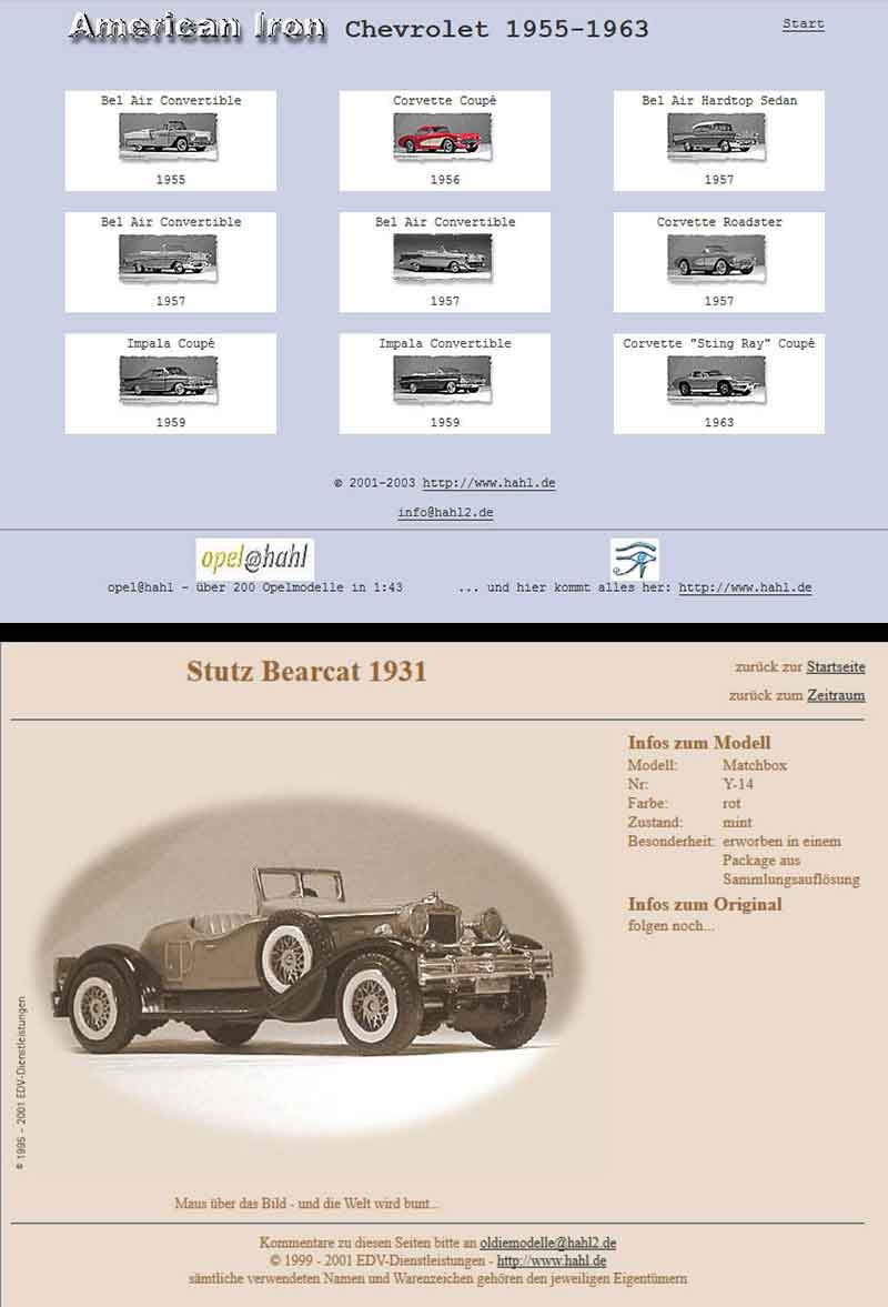 Screenshot_anderehahlmodellede_2001Nach und nach kamen die ersten Nicht-Opel-Modelle mit eigenen Präsenzen ins www: „American Iron“ zeigte Modelle aus den USA in 1:43 aus den Jahren 1948 bis 1970, „Oldies“ brachte Modelle aus aller Welt in 1:43 aus den Jahren 1900 bis 1939.